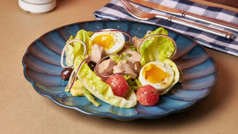 For those who prefer a green start, our salads are far from ordinary. The Salade Niçoise is a hearty, composed salad featuring slow-cooked Akami tuna, potatoes, green beans, and black olives. Alternatively, try the Salade de Laitue au Vieux Comté, a refined combination of crisp Bibb lettuce, French dressing, savory 12-month Aged Comté cheese, spring onions, and croutons.