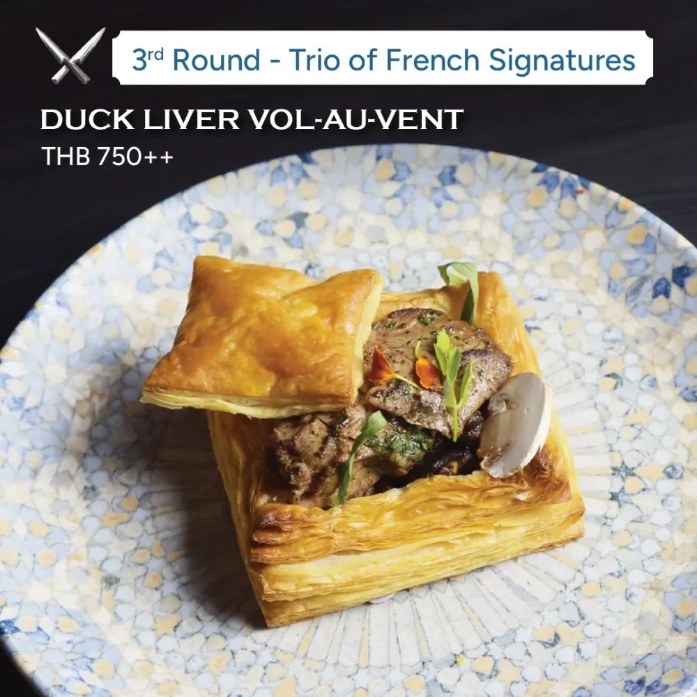 Seared Duck Liver, Crispy Puff Pastry & Sautéed Paris Mushroom in Porto Wine Essence, Black truffle Suprême Sauce A trilogy of harmony where technique meets French soul.