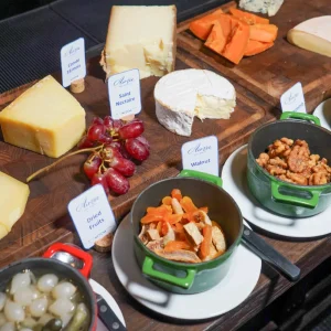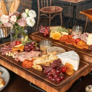 Comté 18 เดือน Brie de Meaux Camembert de Normandie Saint-Nectaire Raclette Gruyère และ Goat Cheese เสิร์ฟพร้อมขนมปังวอลนัท ผลไม้แห้ง แครกเกอร์ และน้ำผึ้ง