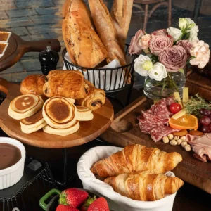 ครัวซองต์เนย ครัวซองต์ช็อกโกแลต ครัวซองต์ราสป์เบอร์รี ขนมปังบาแก็ตต์เล็ก และขนมปังโฮลวีท เสิร์ฟพร้อมเนย น้ำผึ้ง และแยมโฮมเมด กราโนล่าโฮมเมด โยเกิร์ตธรรมชาติ และผลไม้ตามฤดูกาล