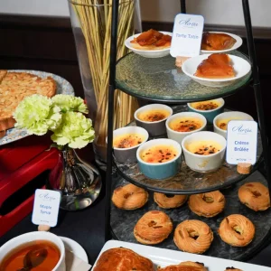 เครมบรูเล่ Paris-Brest ทาร์ตทาติน แพนเค้กราดเมเปิลไซรัป ทาร์ตอัลมอนด์ สตรอว์เบอร์รี่สดกับวิปครีม และผลไม้ตามฤดูกาล